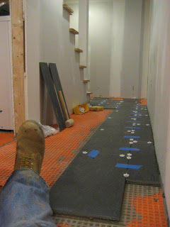 At around 1:30 we FINALLY got to start laying some tile. We spent about an hour dry laying tile to figure out where all the joints will fall. Lastly we set a few chalk lines down the length of the hallway to use as a guide and keep the tile straight. Jason got to put the first tile down.