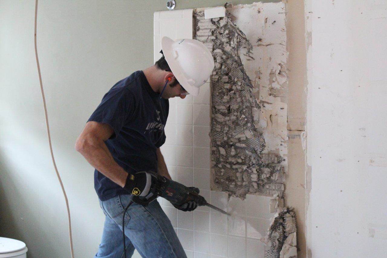 I started with the bathroom using the hammer drill to get the tile off the wall. It was thick set tile with metal lath. Lauren quickly took over when she arrived.